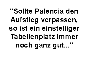 Honni: Ja, das ist aber jetzt eine blöde Frage, Honni. Aber seis drum, Du hast ja auch kein Journalistik studiert. Natürlich wird es sehr, sehr schwer. Auch Getafe hat gegen Lemona Federn gelassen und einen Punkt verloren. Sollten wir siegen, können wir vielleicht Boden gut machen und womöglich an Oviedo und/oder Getafe vorbeiziehen. Wobei ich aber auch betone, dass wir mit Palencia genauso nach unten blicken müssen. Vecindario und Orihuela lauern nur auf einen Ausrutscher.